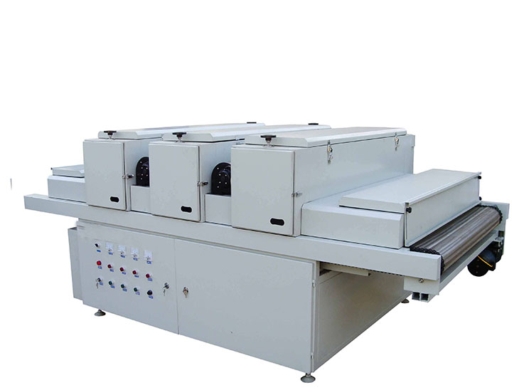 高壓汞燈。該燈管光變普范圍在350 nm-450 nm之間,主峰值為365 nm,采用進口石英管材及鎢鉬材料,用料好、強度高、壽命長,燈罩與工作面140-180mm高度范圍可調,提高了固化質量,并可全光或半光工作。輸送部分采用輥筒式輸送設計,不易變形,運送物料更加平穩,工作中無需調整,沒有噪音,改善了由于輸送帶跑偏而產生的不便維修很方便。配置大流量排風系統,散熱效果好,確保箱體內的溫度始終在標準值范圍內,使